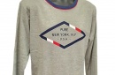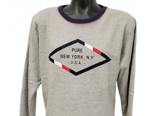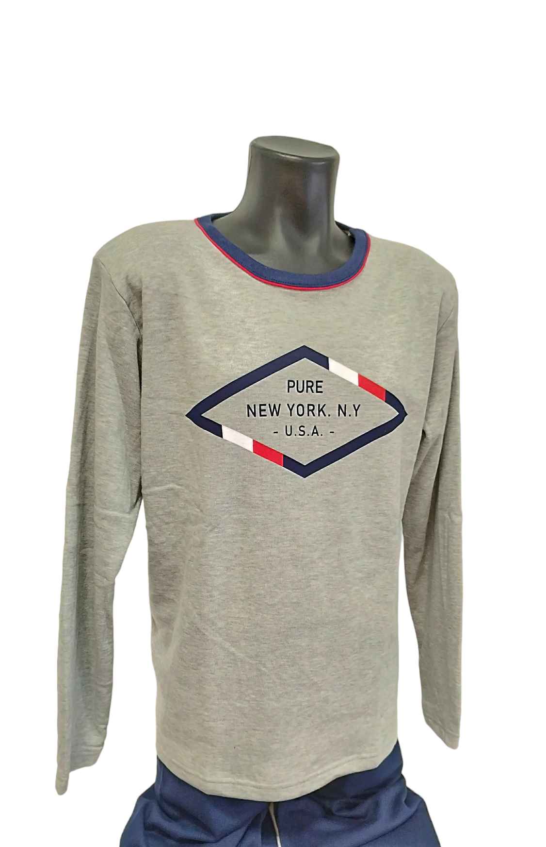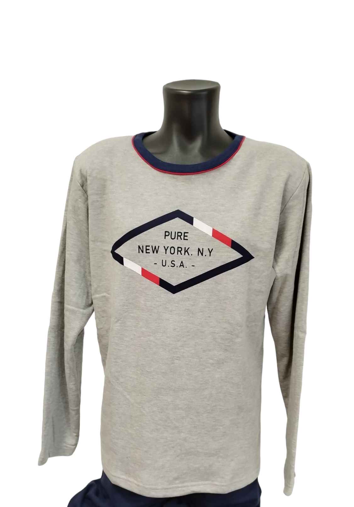 COMPOSIÇÃO E CARACTERÍSTICAS Ref.: Pij pure cinza/azul Pijama de homem cardado Camisola com decote redondo Calça lisa com punho 50% Algodão 50% Poliéster Fabricado em Portugal