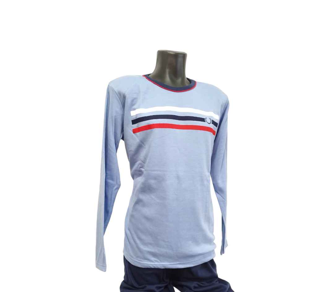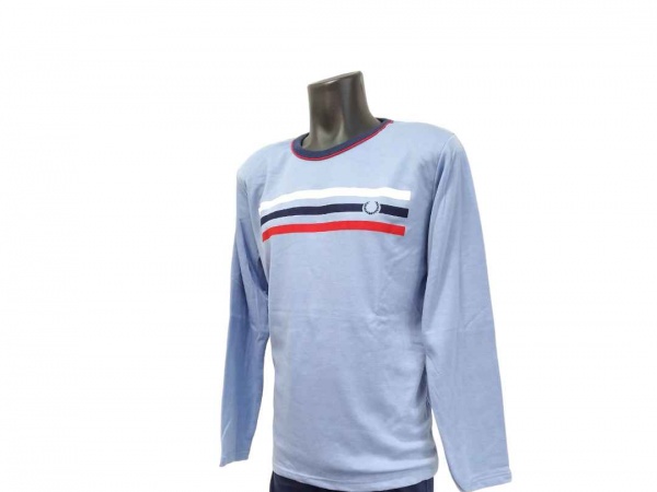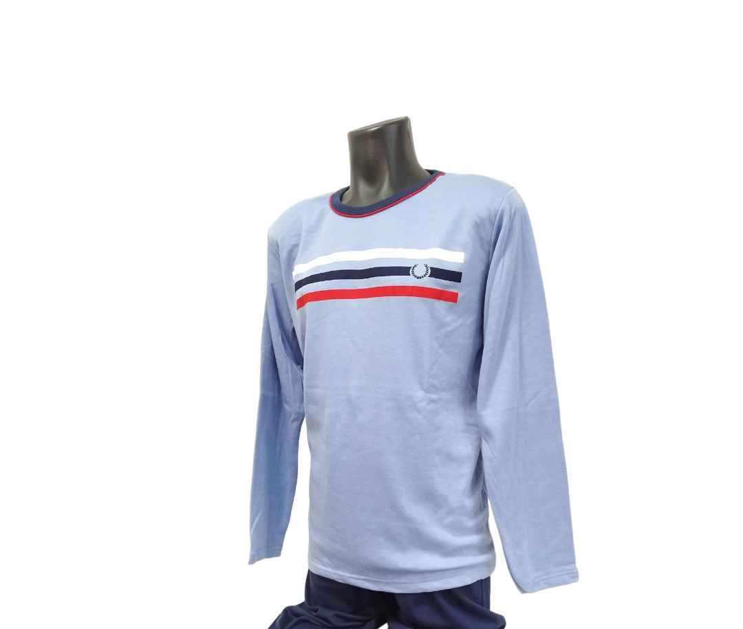 COMPOSIÇÃO E CARACTERÍSTICAS Ref.: Pij liso ricas Azul Pijama de homem cardado Camisola com decote redondo Calça lisa com punho 50% Algodão 50% Poliéster Fabricado em Portugal
