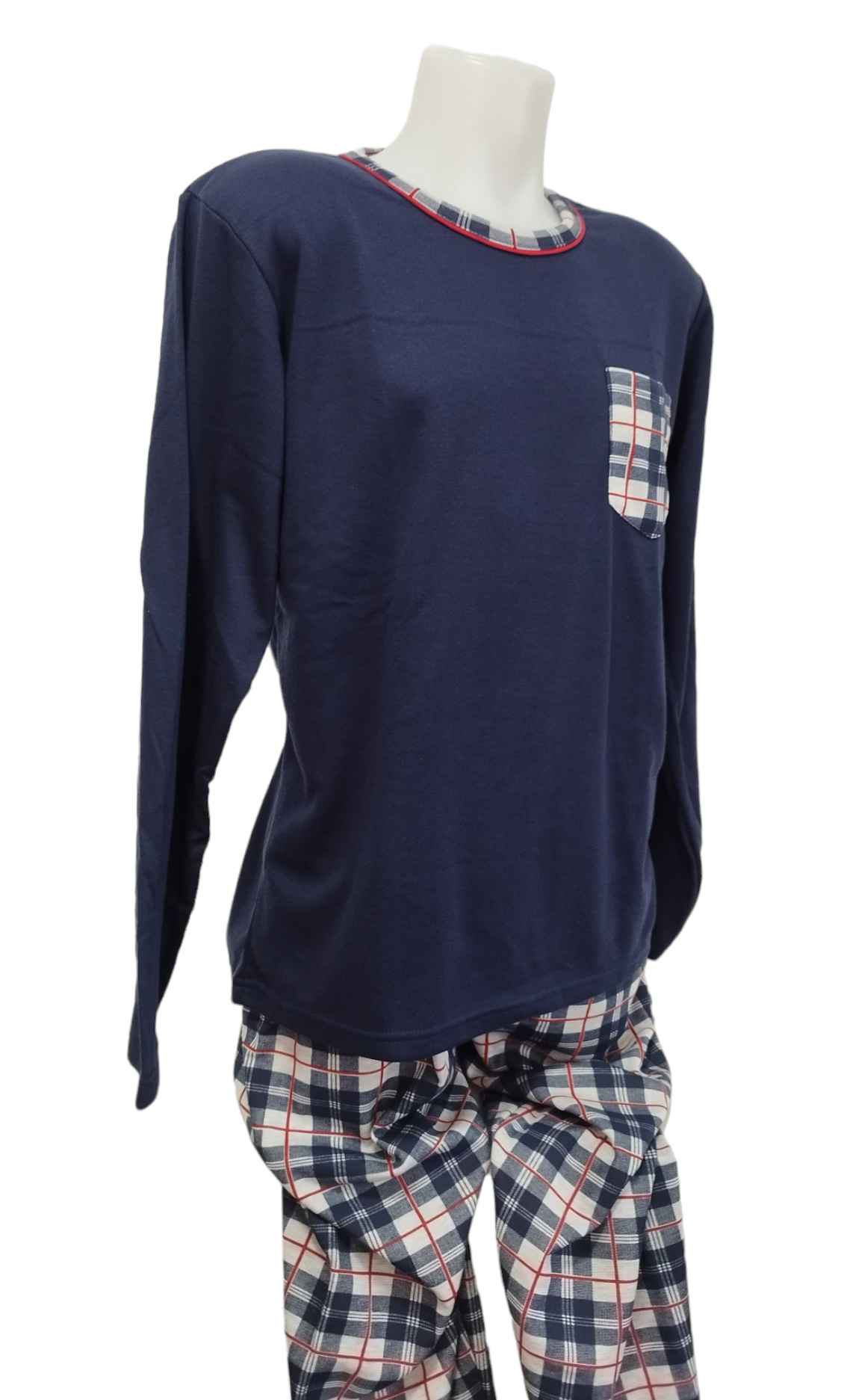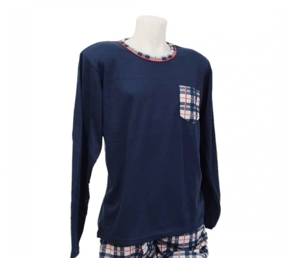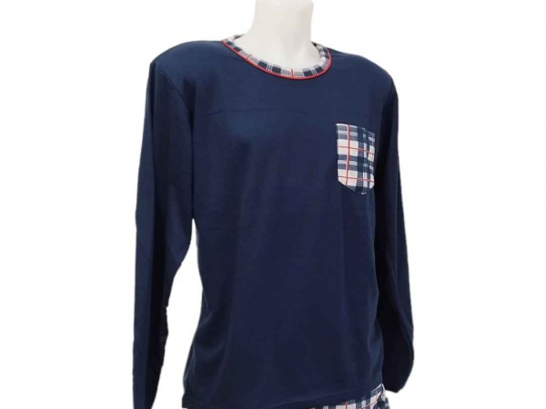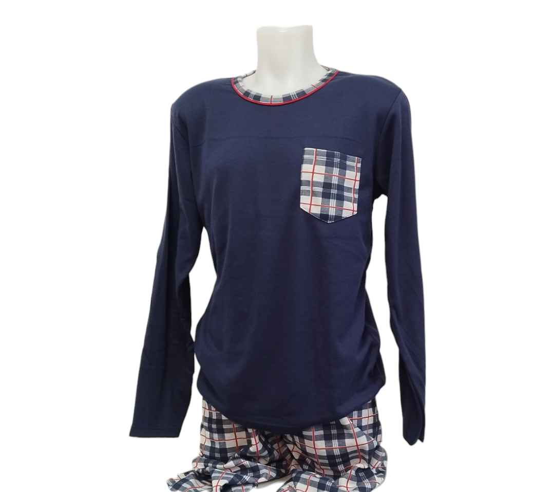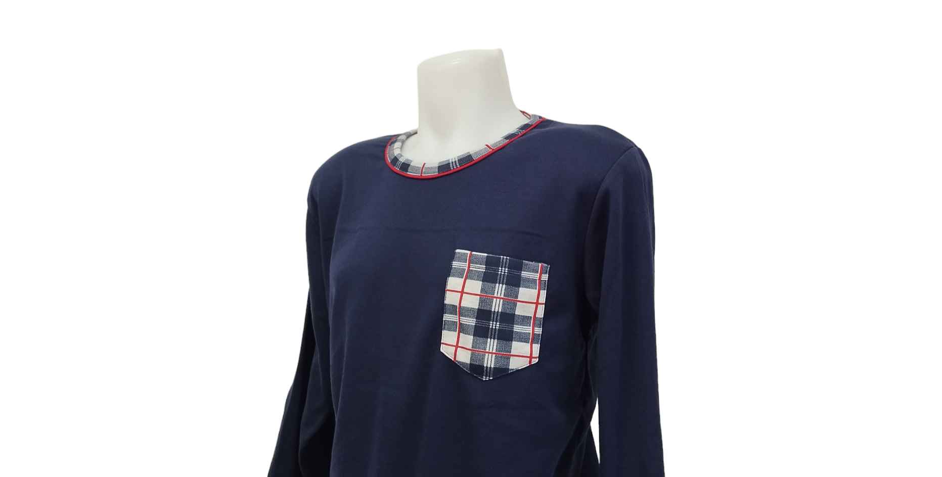 COMPOSIÇÃO E CARACTERÍSTICAS Ref.: Pij H Xadrez Azul Pijama de homem cardado Camisola com decote redondo Calça xadrez com punho 50% Algodão 50% Poliéster Fabricado em Portugal