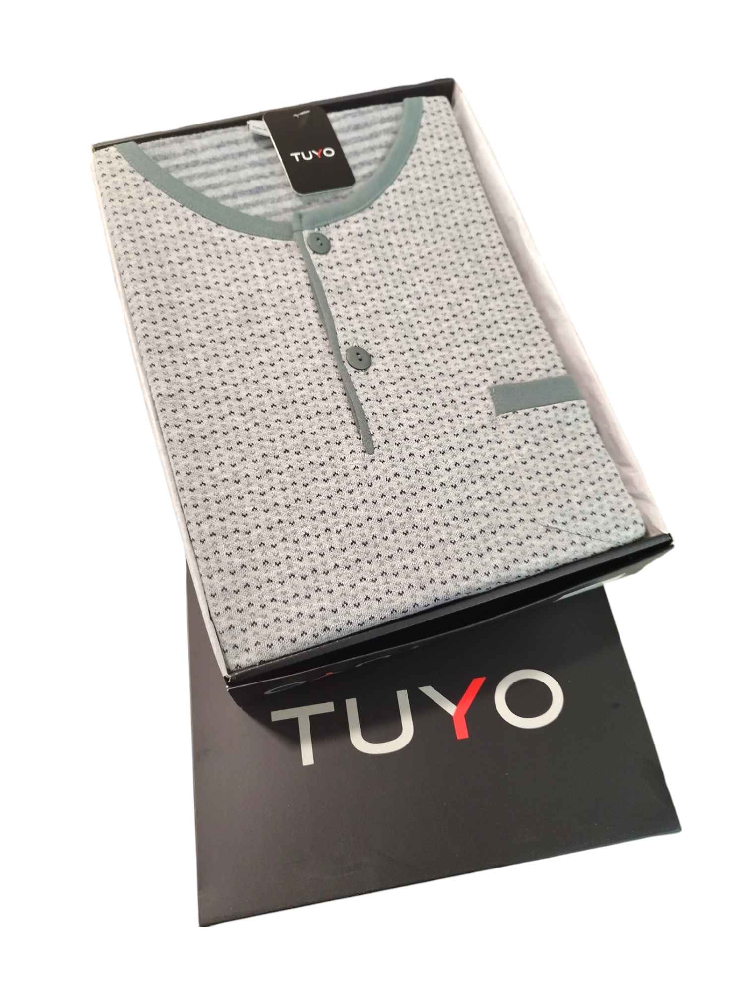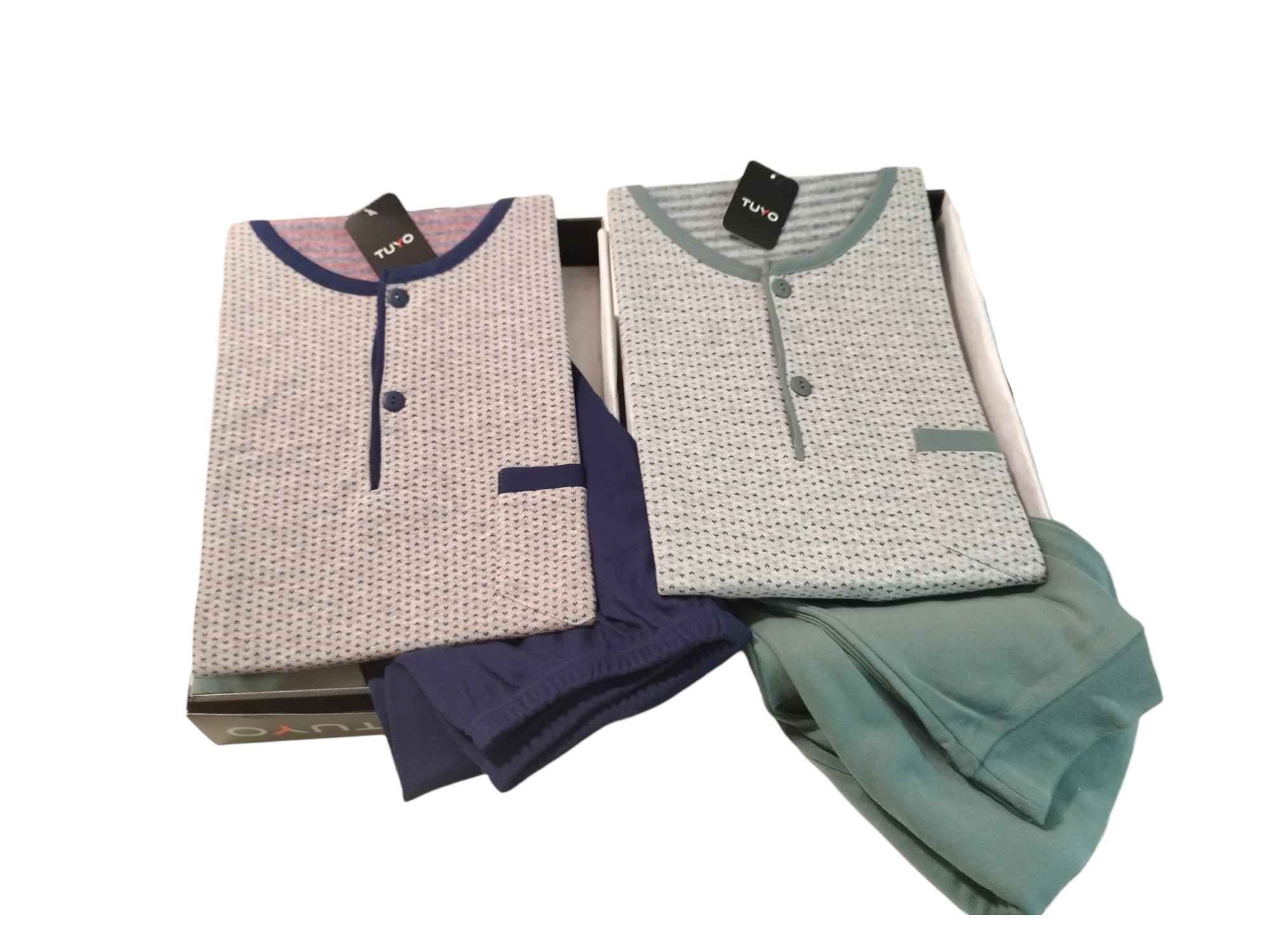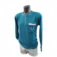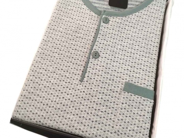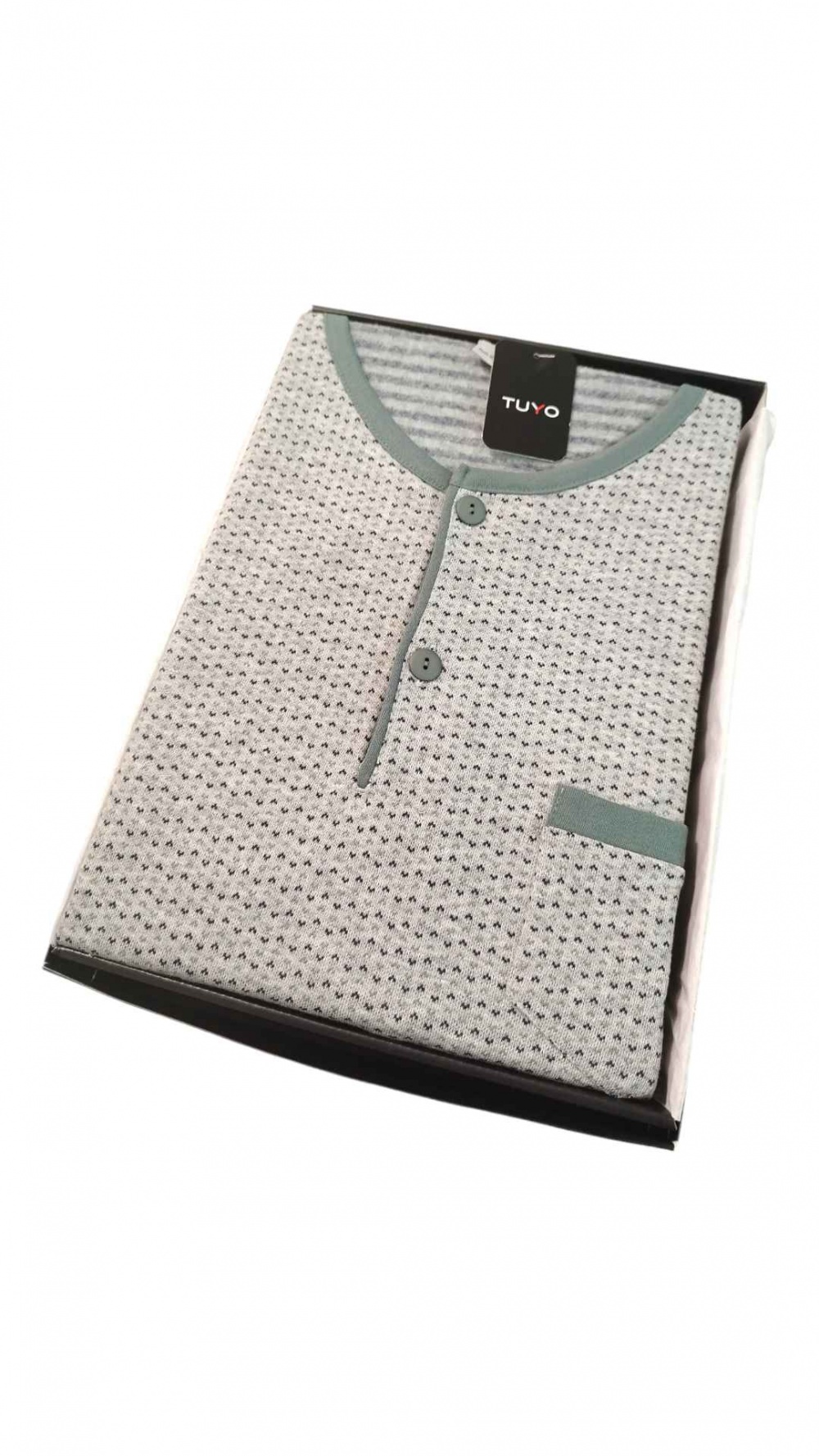 COMPOSIÇÃO E CARACTERÍSTICAS Ref.: Pij Tuyo Homen Verde Pijama de homem com pêlo, cardado camisola jackard com 2 botões calça lisa com punho 50% Algodão 50% poliéster Fabricado em Portugal