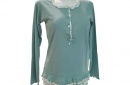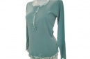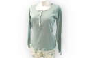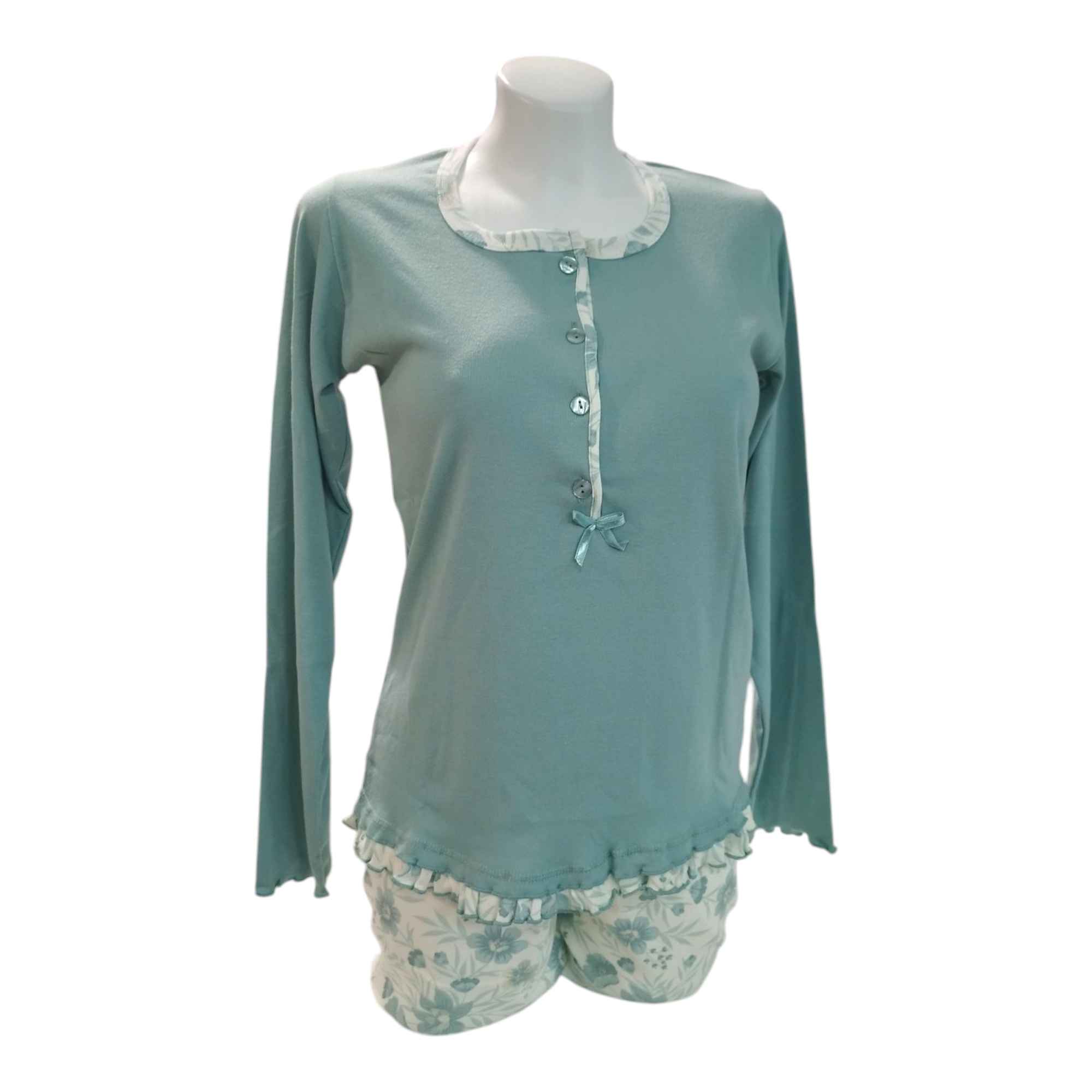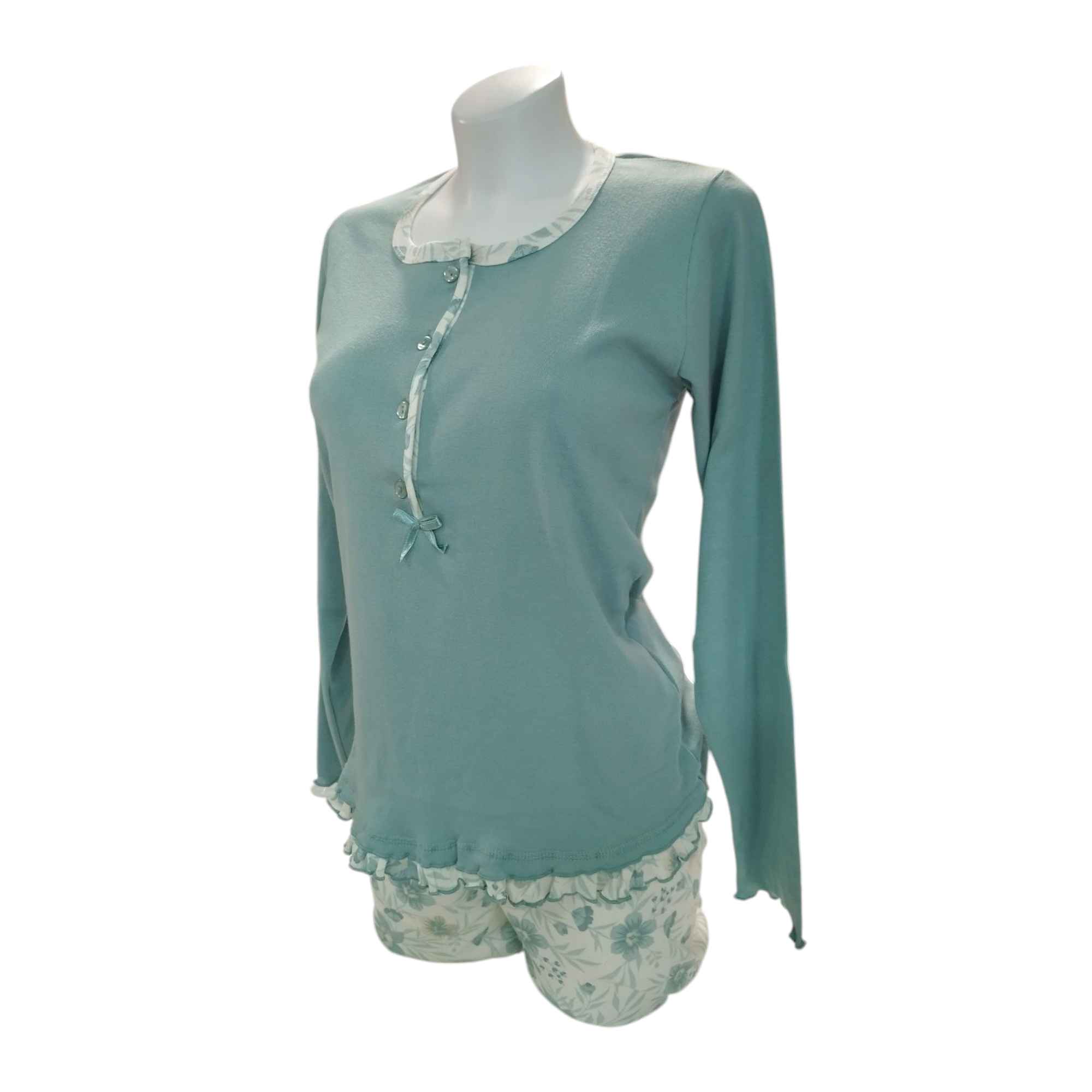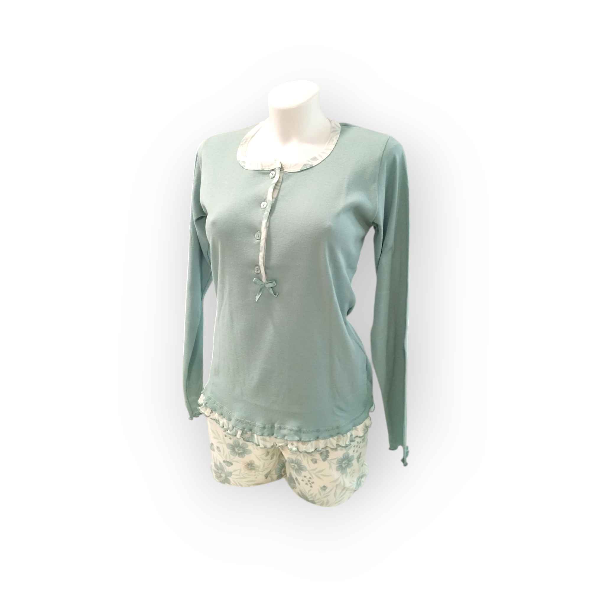 COMPOSIÇÃO E CARACTERÍSTICAS Ref.: Pij dotti verde25 Pijama de senhora 100% Algodão sem pêlo camisola com 3 botões calça estampada com punho malha macia e confortável Fabricado em Portugal