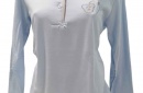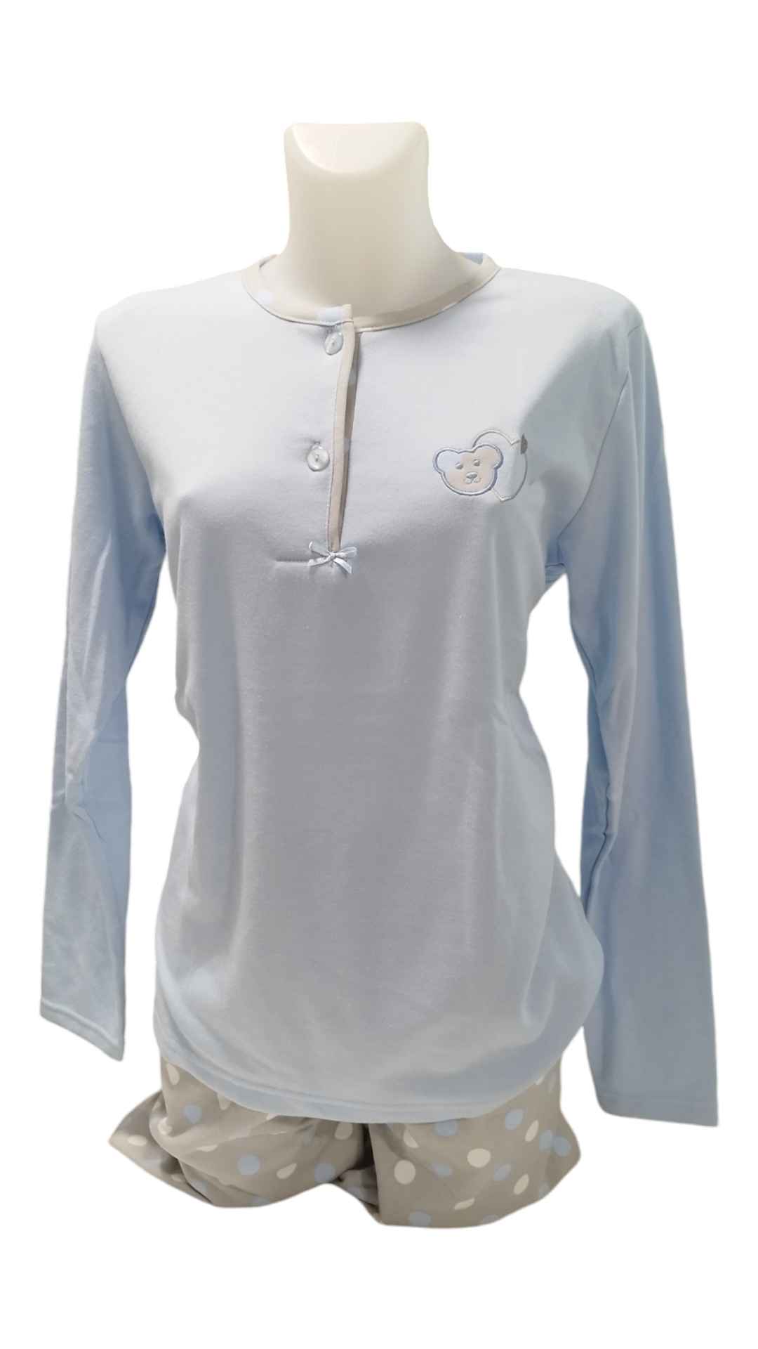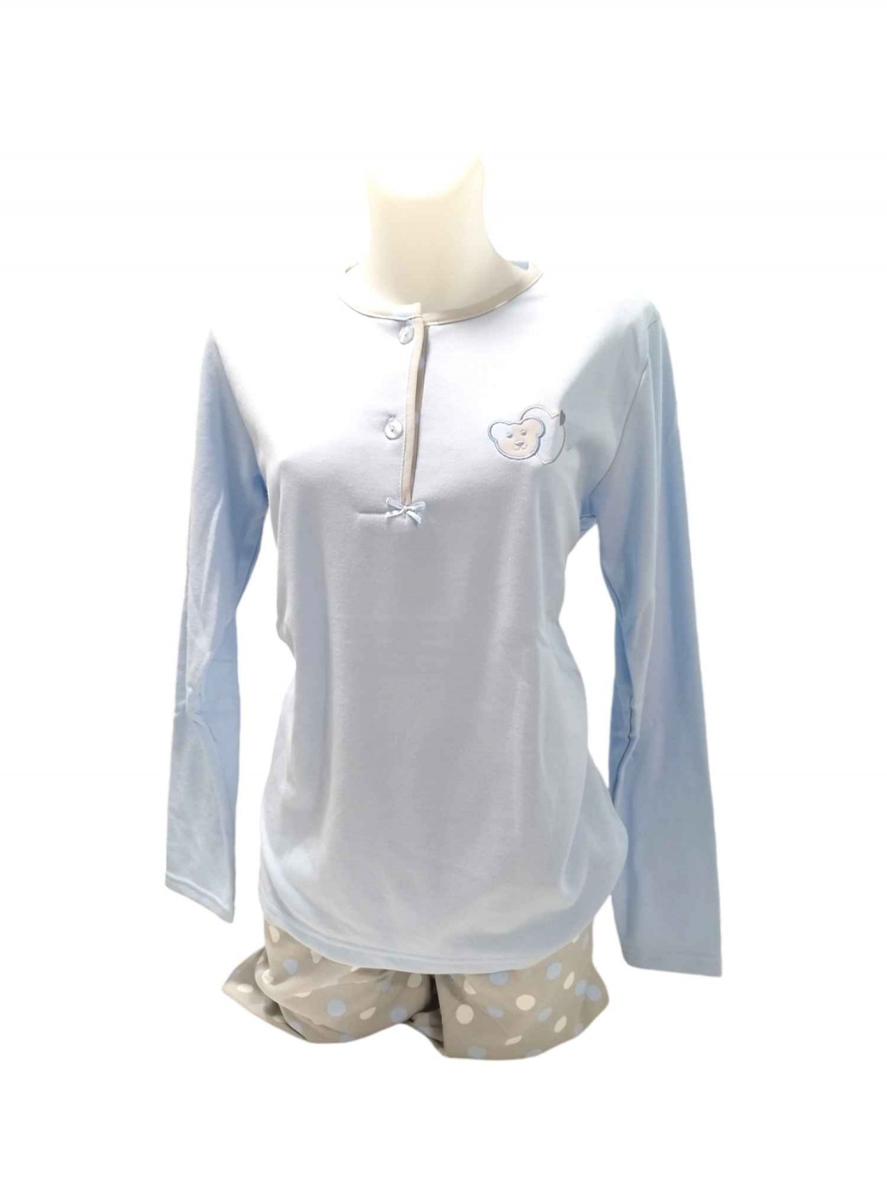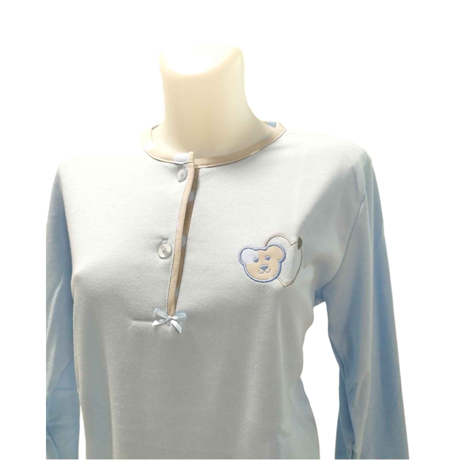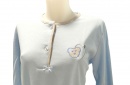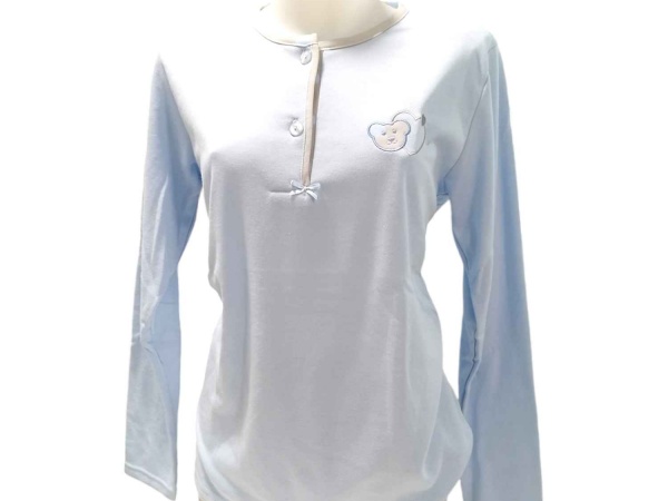 COMPOSIÇÃO E CARACTERÍSTICAS Ref.: Pij Pure azul B Pijama de senhora cardado camisola de 2 botões calça com punho 50% Algodão 50% poliéster Fabricado em Portugal