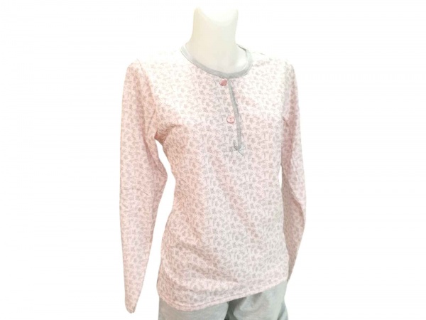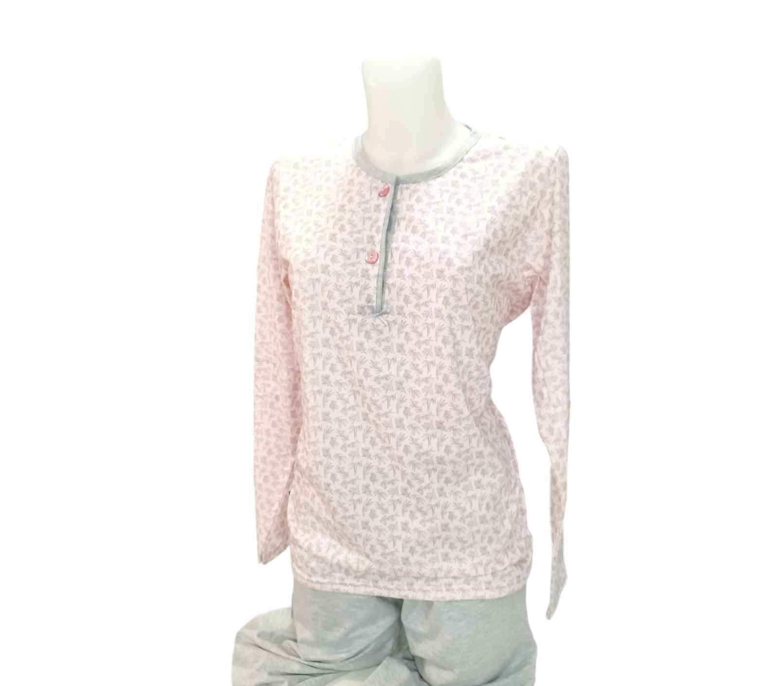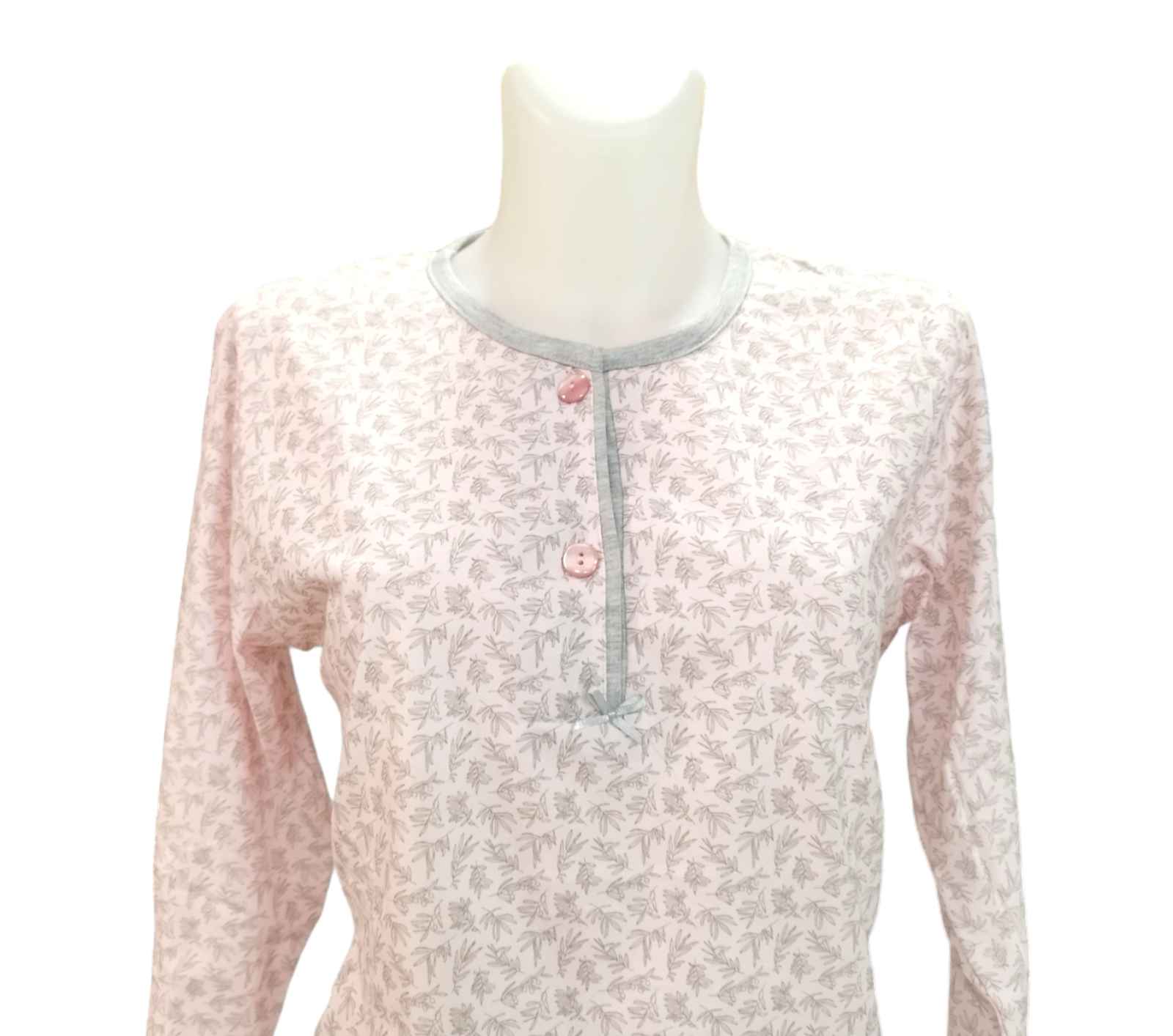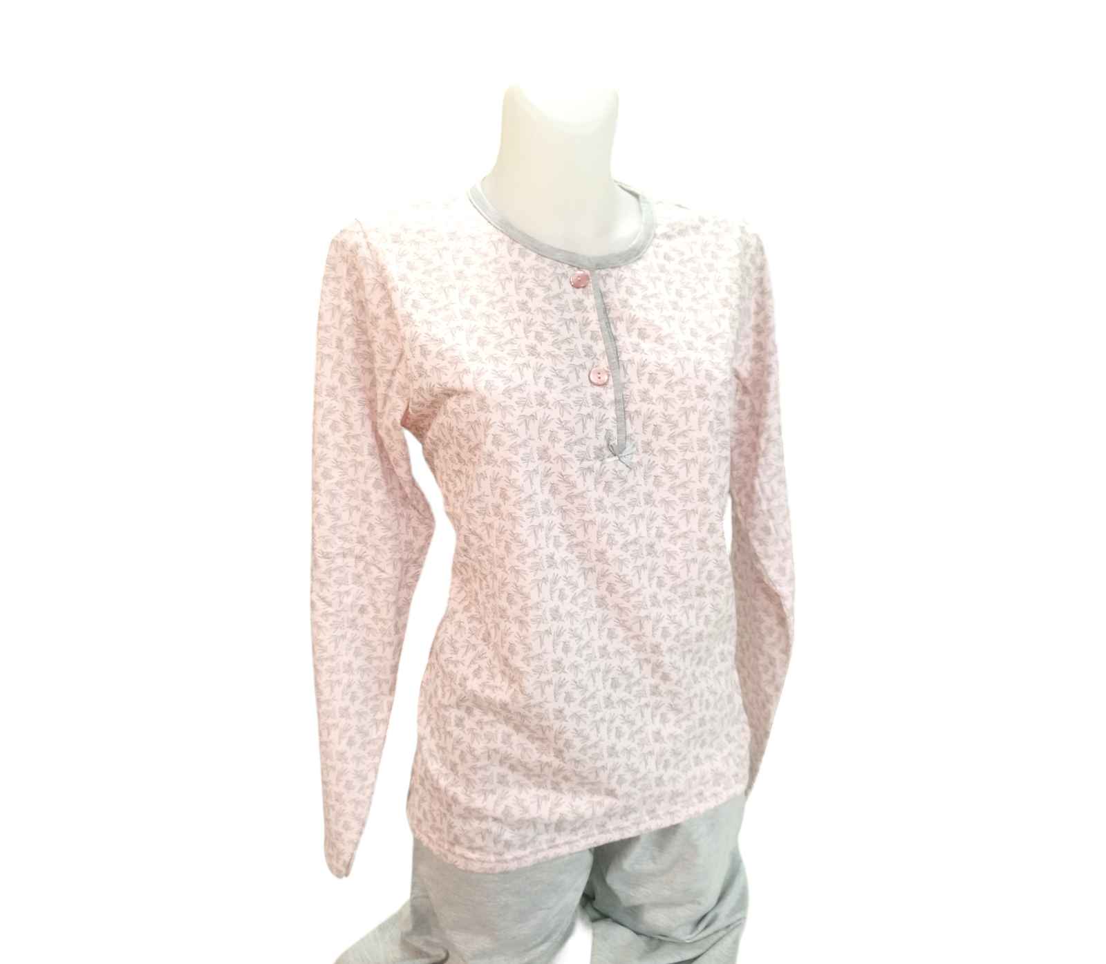 COMPOSIÇÃO E CARACTERÍSTICAS Ref.: Pij fino folhas rosa Pijama de senhora primavera manga comprida calça com punho 50% algodão 50% algodão Fabricado em Portugal
