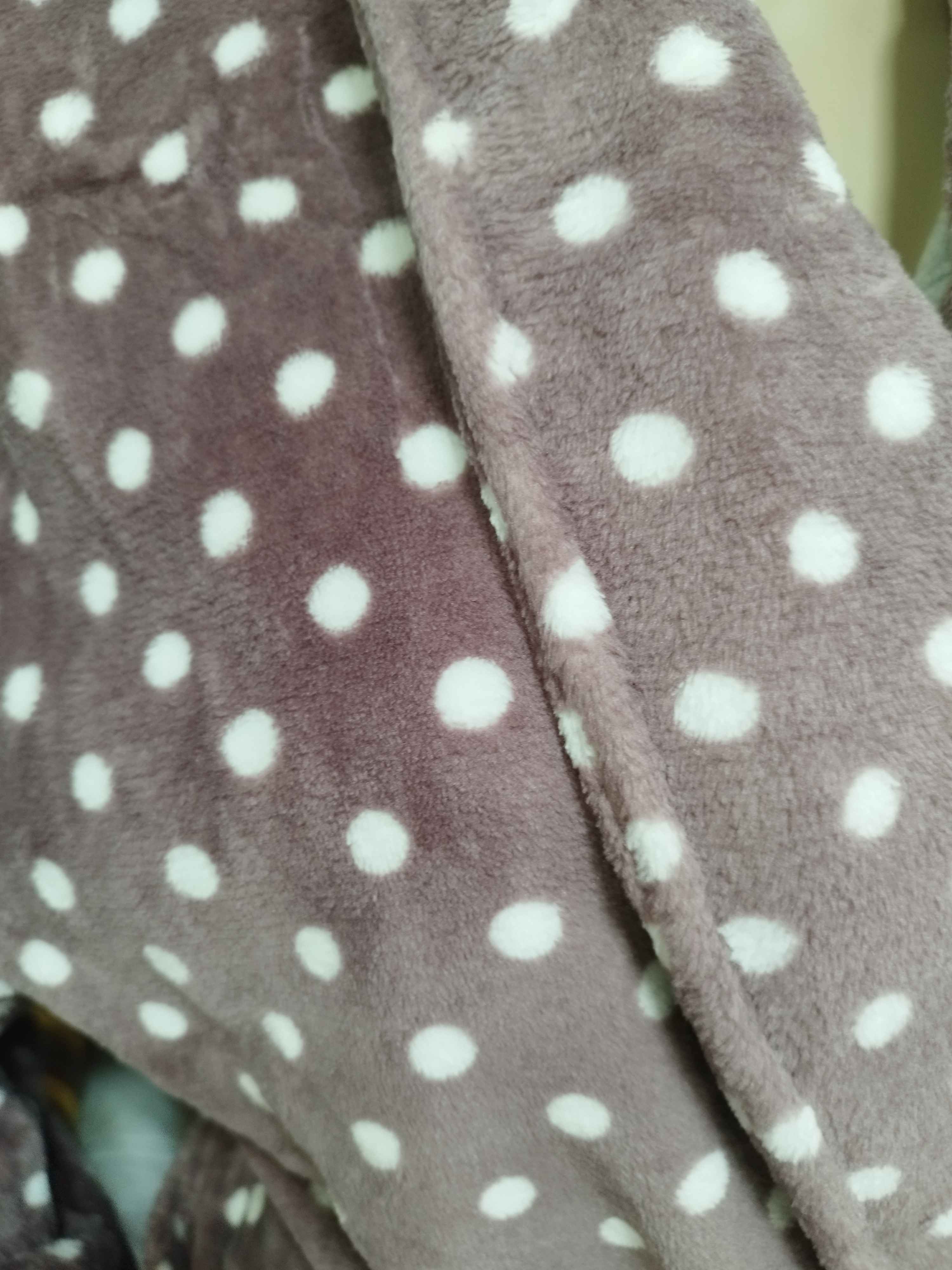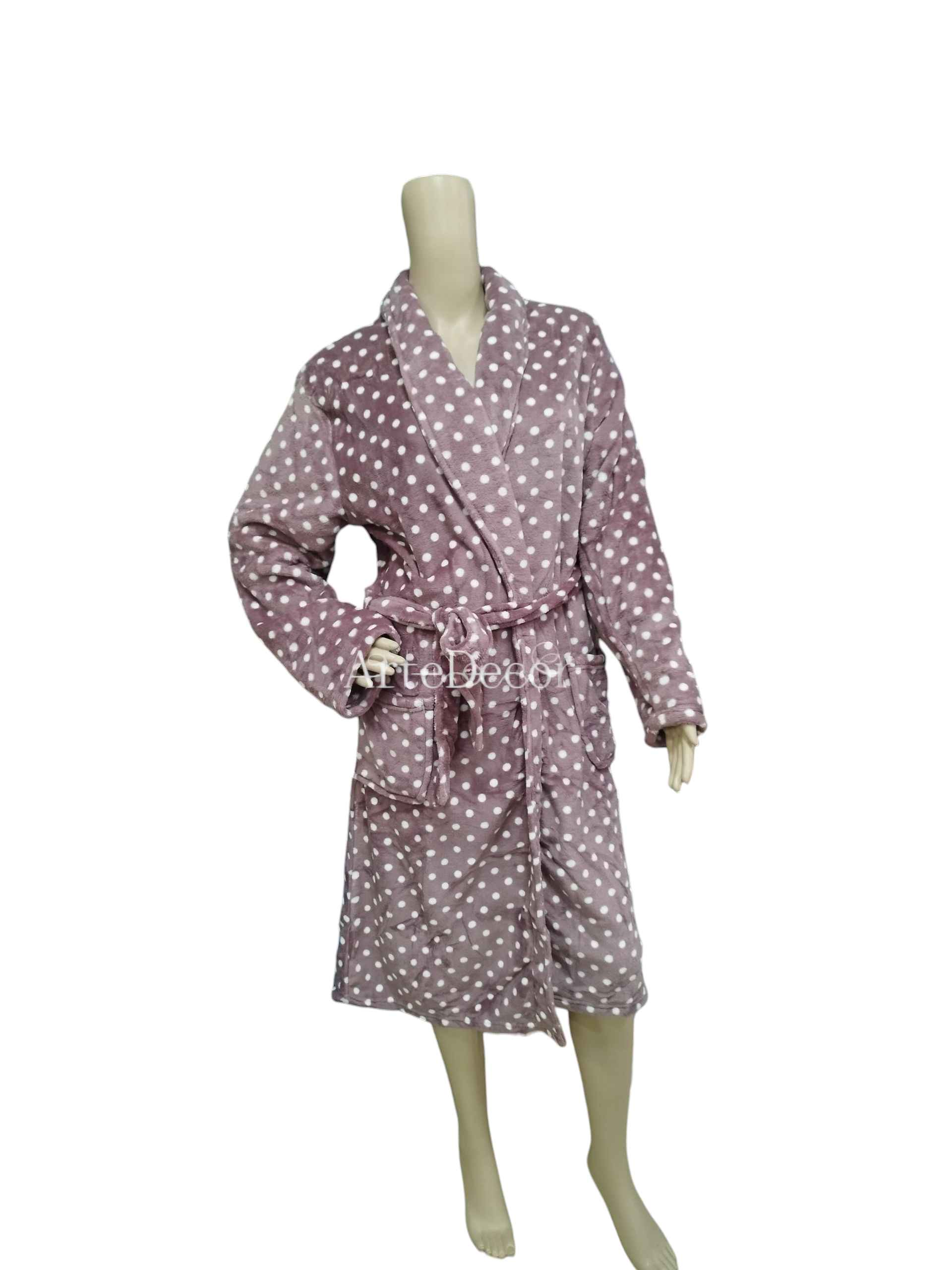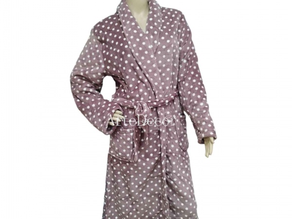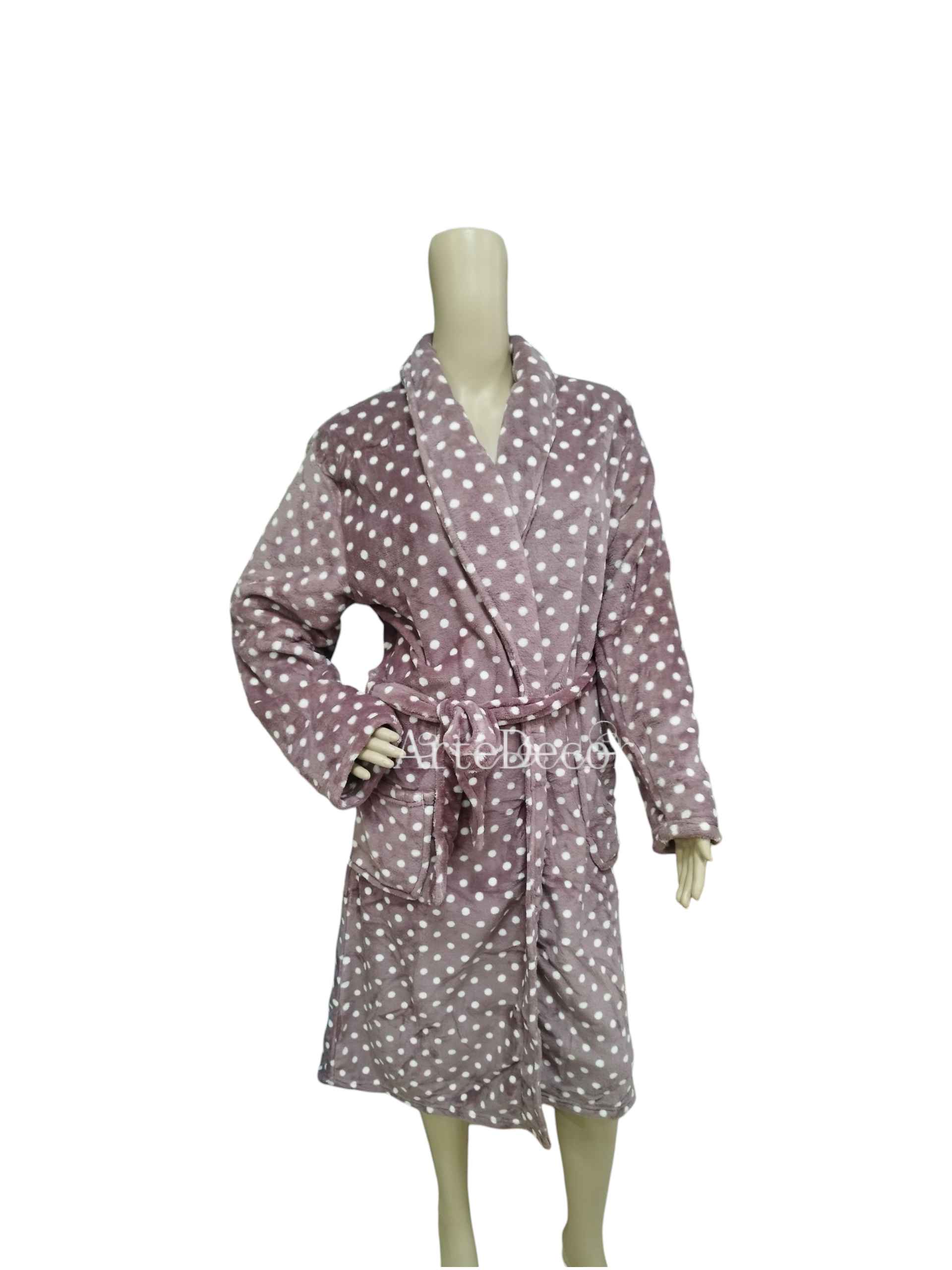Envolva-se em conforto e charme com o nosso robe de senhora em coralina, totalmente estampado com bolinhas. Fabricado com tecido coralina de alta qualidade, este robe oferece um toque ultra suave e quente, perfeito para os dias mais frios. O padrão alegre de bolinhas confere-lhe um estilo divertido e feminino, enquanto o corte estrepasse garante um ajuste elegante e confortável. Ideal para relaxar em casa com estilo.