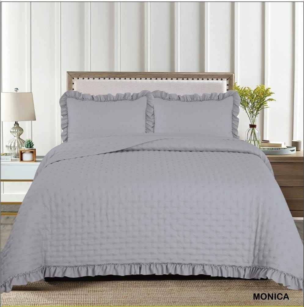 COMPOSIÇÃO E CARACTERÍSTICAS Ref.: Ed folho cinzento Edredon / colcha muito suave e confortável Ideal para verão 1 Colcha com folho 240x260cm 2 Fronhas de Almofada 50x70cm