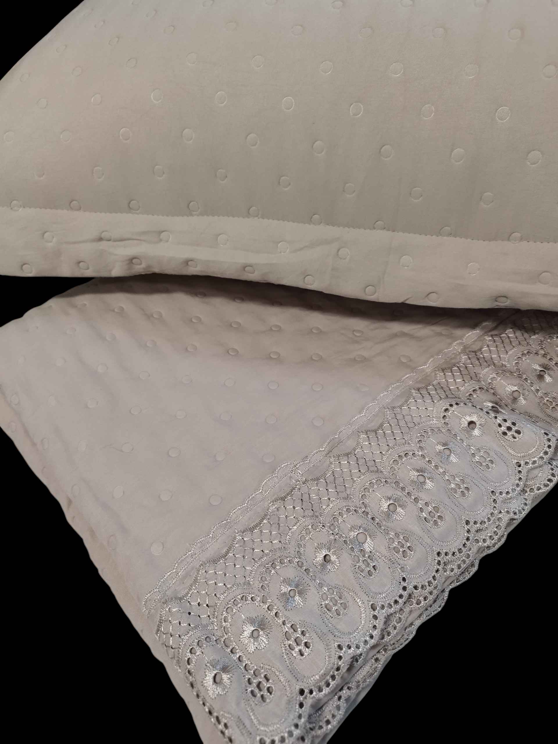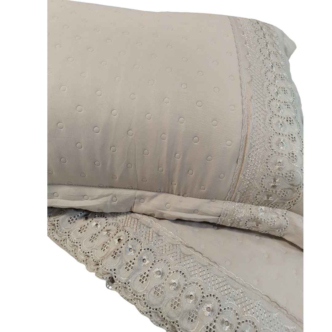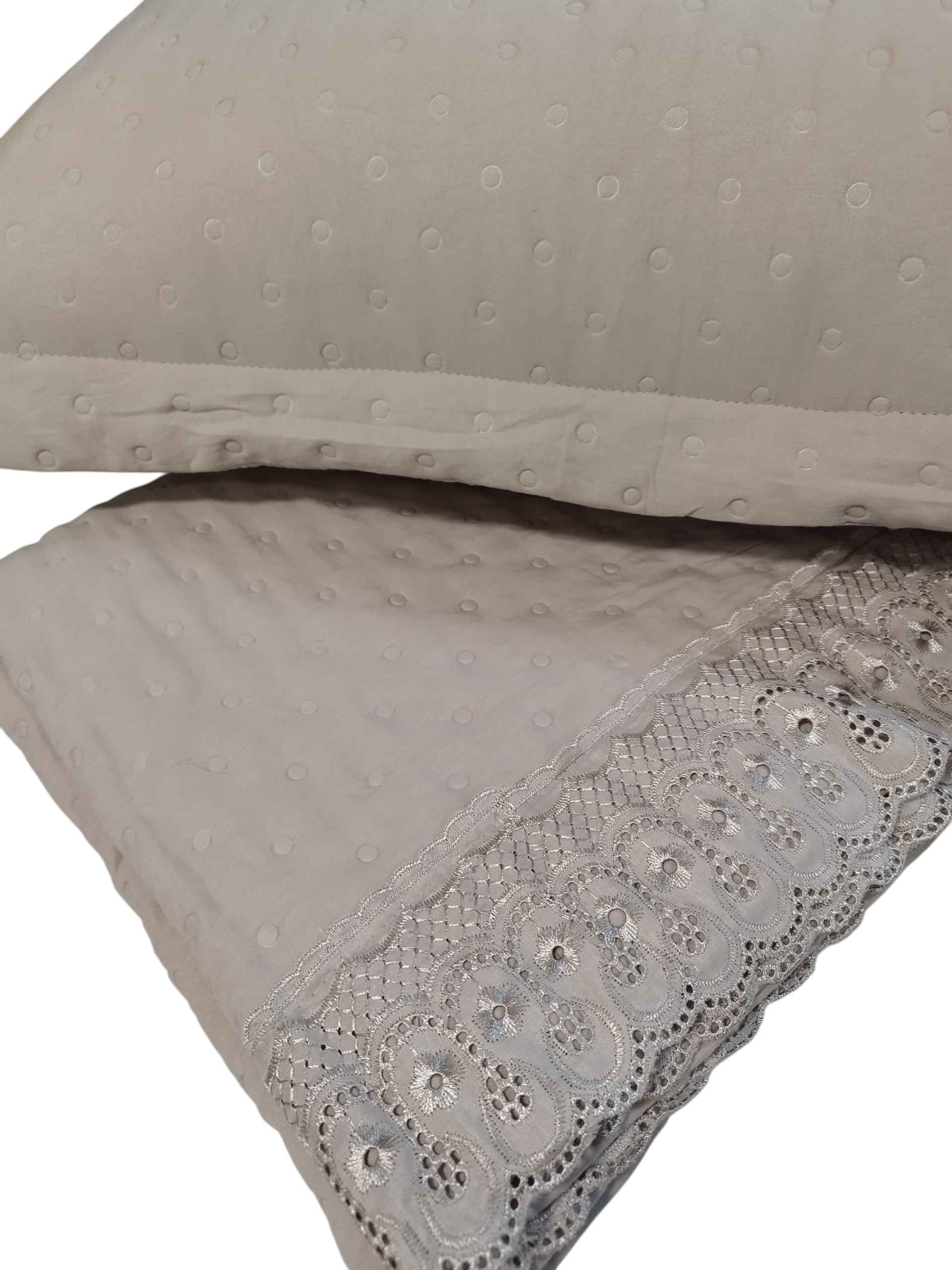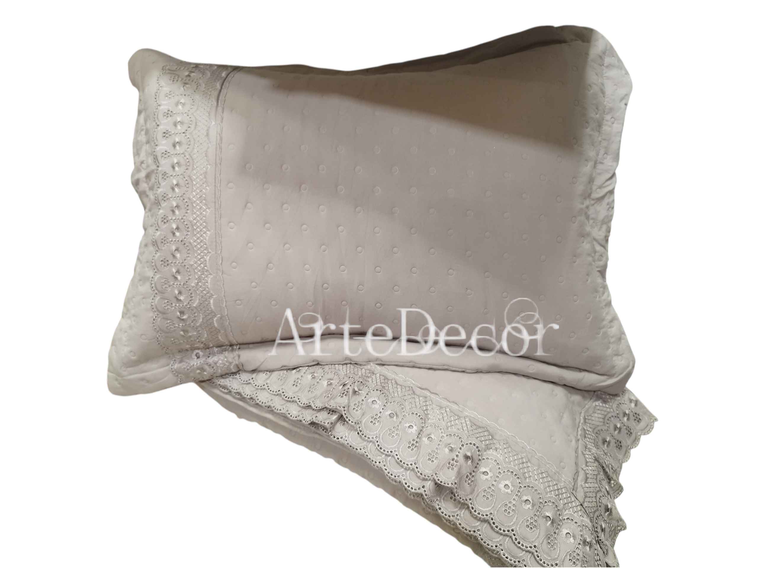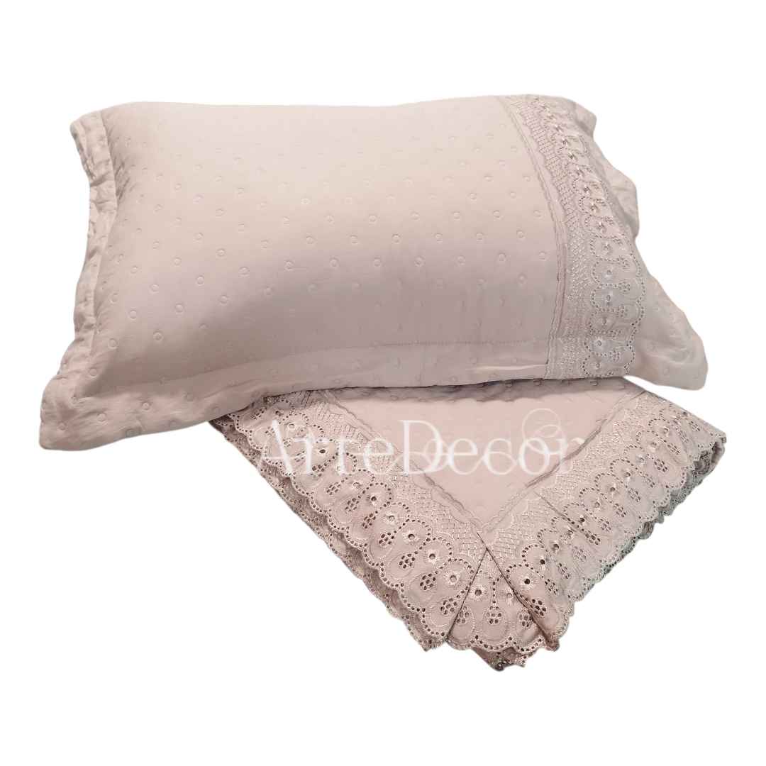 COMPOSIÇÃO E CARACTERÍSTICAS Ref.: Colcha com renda terra Colcha muito suave com aplicação de renda, tornando o ambiente requintado e sofisticado. Incluí 2 fronhas de almofada 50x70cm Colcha 250x260cm