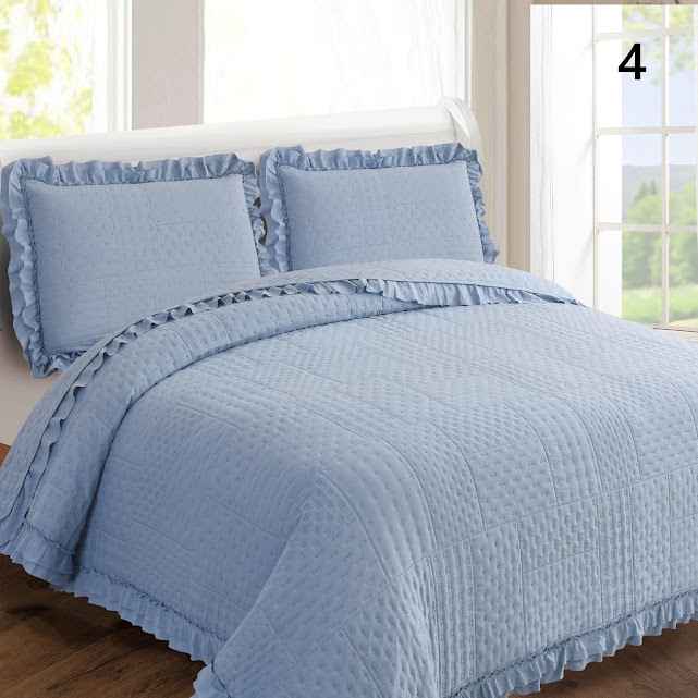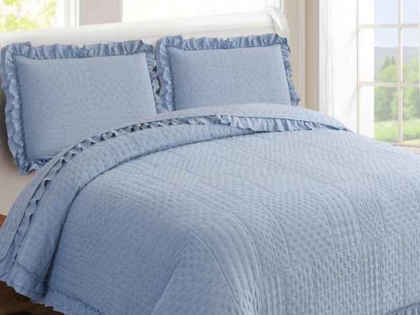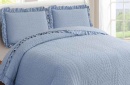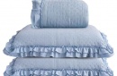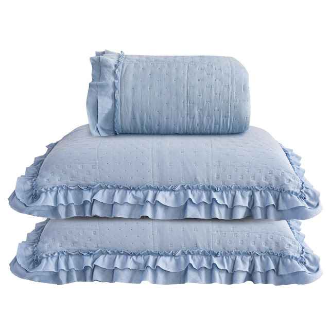 COMPOSIÇÃO E CARACTERÍSTICAS Ref.: Colcha folho duplo Azul Colcha muito suave e confortável Ideal para verão 1 Colcha com folho 250x260cm 2 Fronhas de Almofada 50x70cm