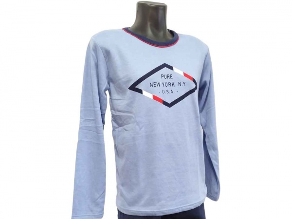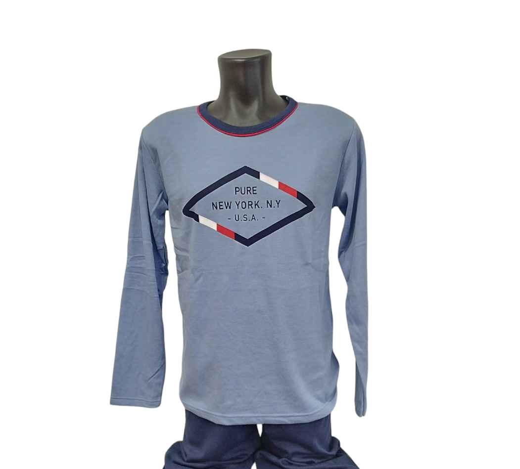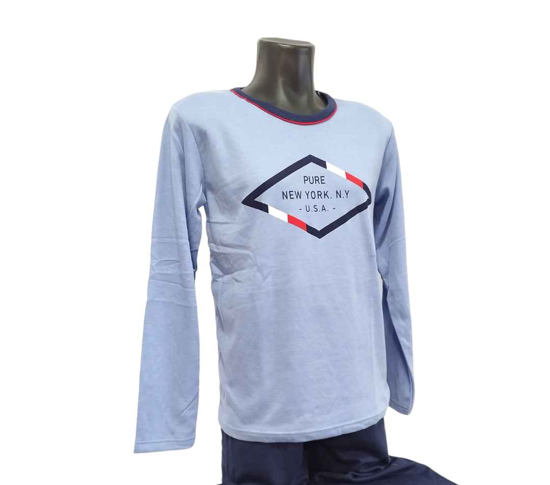 COMPOSIÇÃO E CARACTERÍSTICAS Ref.: Pij pure azul Pijama de homem cardado Camisola com decote redondo Calça lisa com punho 50% Algodão 50% Poliéster Fabricado em Portugal