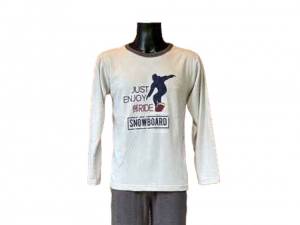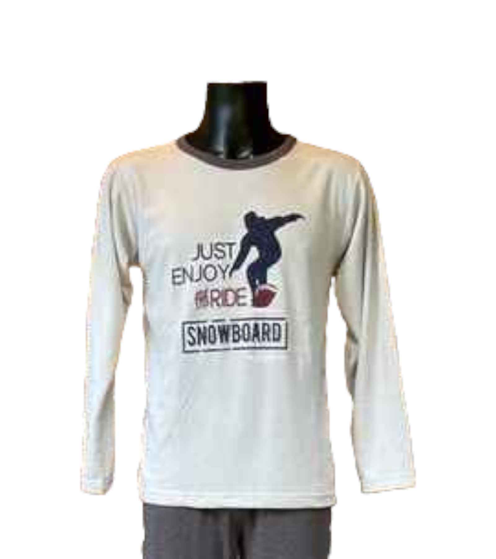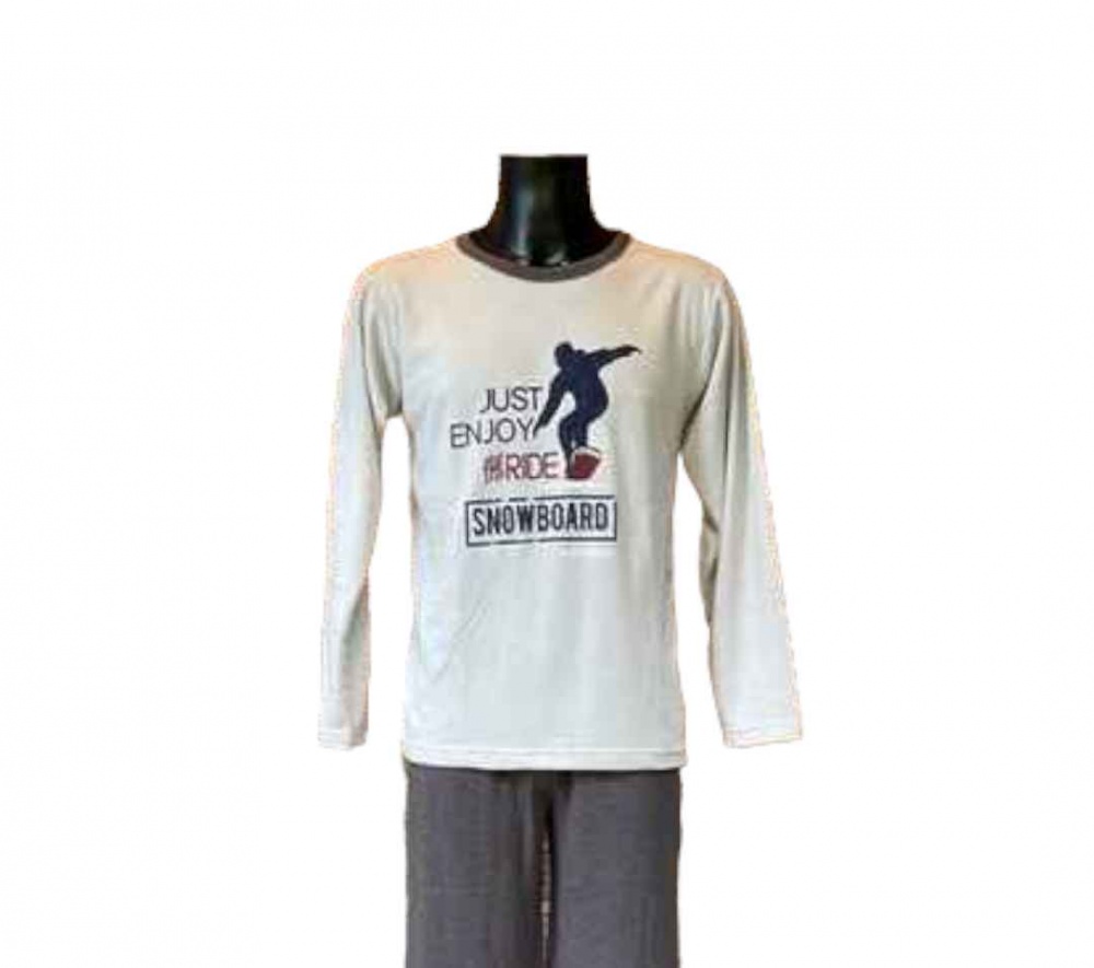 COMPOSIÇÃO E CARACTERÍSTICAS Ref.: Pij snowboard cinza Pijama menino cardado Camisola com decote redondo Calça lisa com punho 50% Algodão 50% Poliéster Fabricado em Portugal