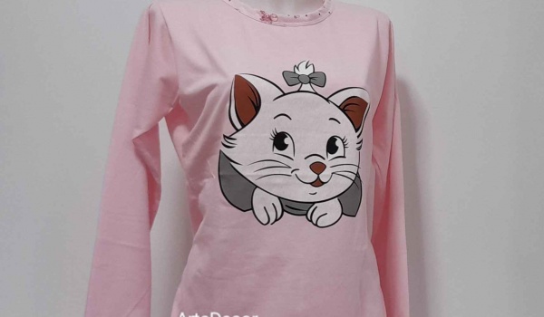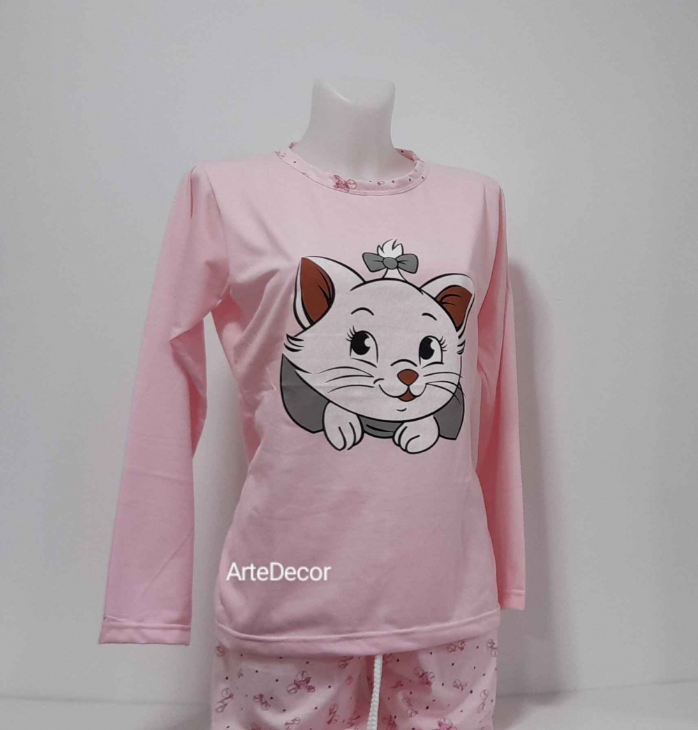 COMPOSIÇÃO E CARACTERÍSTICAS Ref.: Pij 22 gato rosa Pijama fino manga comprida calça estampada com punho 50% algodão 50% algodão Fabricado em Portugal